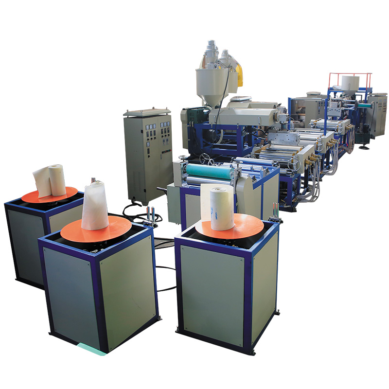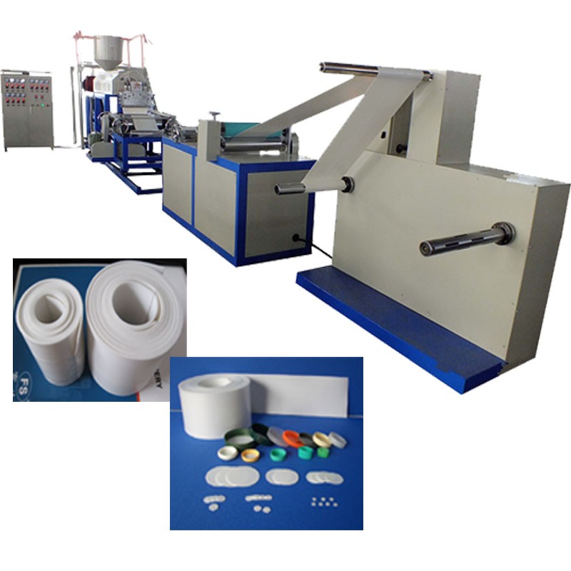 This PE cap seal liner foam extrusion machine produce chemically foamed low density foam sheet for bottle cap, handbag, box, etc. The extrusion output is about 45 – 65kg/H, thickness range is 1.0-3.0mm.